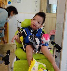 給食は夏まつりの特別メニューです。「やたいとおなじ!」と言ってうれしそうに焼きそばや
