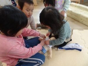 ボタンをつけやすい所は、1歳児にさせてあげている。