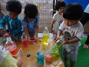 色水遊びでは、カップに水を注ぎました。気分はまるでジュース屋さん!