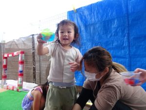 題して『お化けをやっつけろ大作戦』。水鉄砲に水を入れて、ねらいを定めて、発射。