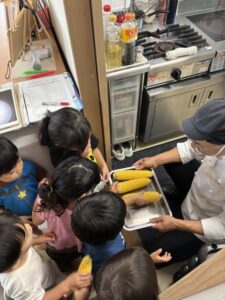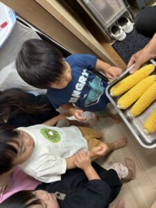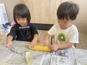 前日準備として、夏祭り当日に給食で食べるとうもろこしの皮むきを