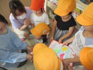 3歳児以上のお友だちは、かき氷の案内を渡しに行ってくれました。