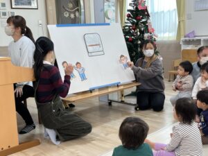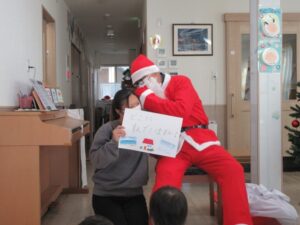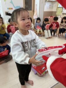 どこからか、鈴の音が聞こえ、サンタさんがプレゼントをもって現れ…。少し戸惑ってしまったお友だちもいたけれど、プレゼントはしっかり頂きましたよ!