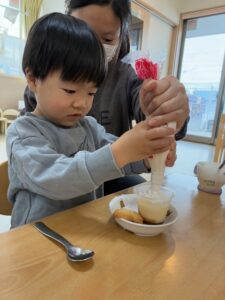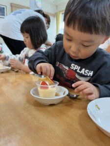 おやつ時には、プリンデコレーションを体験。
